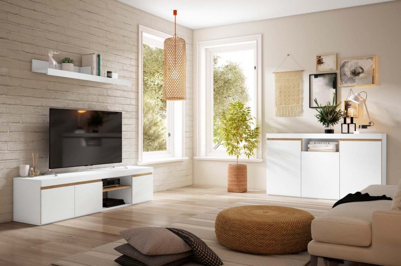 El Aparador 3 puertas Elis de 140 cm, está realizado en melamina de alta calidad de 16 mm. con acabado en color blanco mate y detalles en naturale. Este mueble cuenta una base plana para apoyar el televisor o cualquier elemento decorativo, además de un espacio de almacenaje compuesto por una bandeja central perfecta para ubicar todo tipo de aparatos (reproductores, consolas...), y tres puertas abatibles que habilitan otros tres espacios extra para guardar según necesidad.