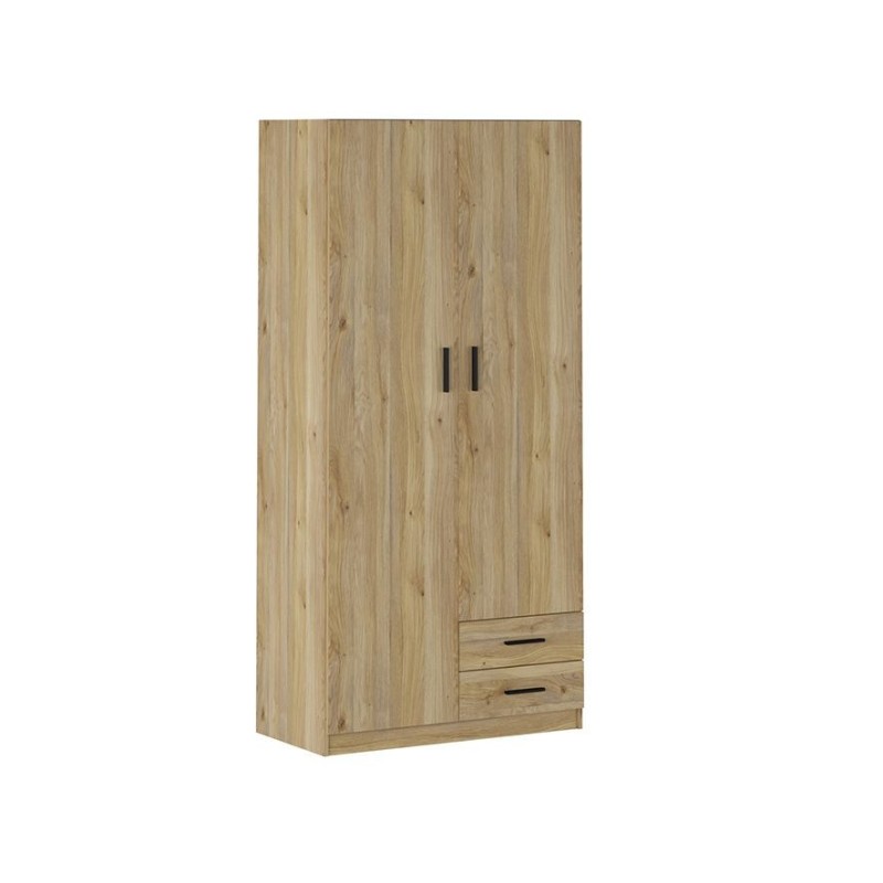 Organiza tu ropa con el armario Aura. Su diseño práctico de 2 puertas y 2 cajones, fabricado en melanina de alta calidad, ofrece una solución de almacenamiento elegante y funcional para mantener tu dormitorio en perfecto orden con un toque moderno.