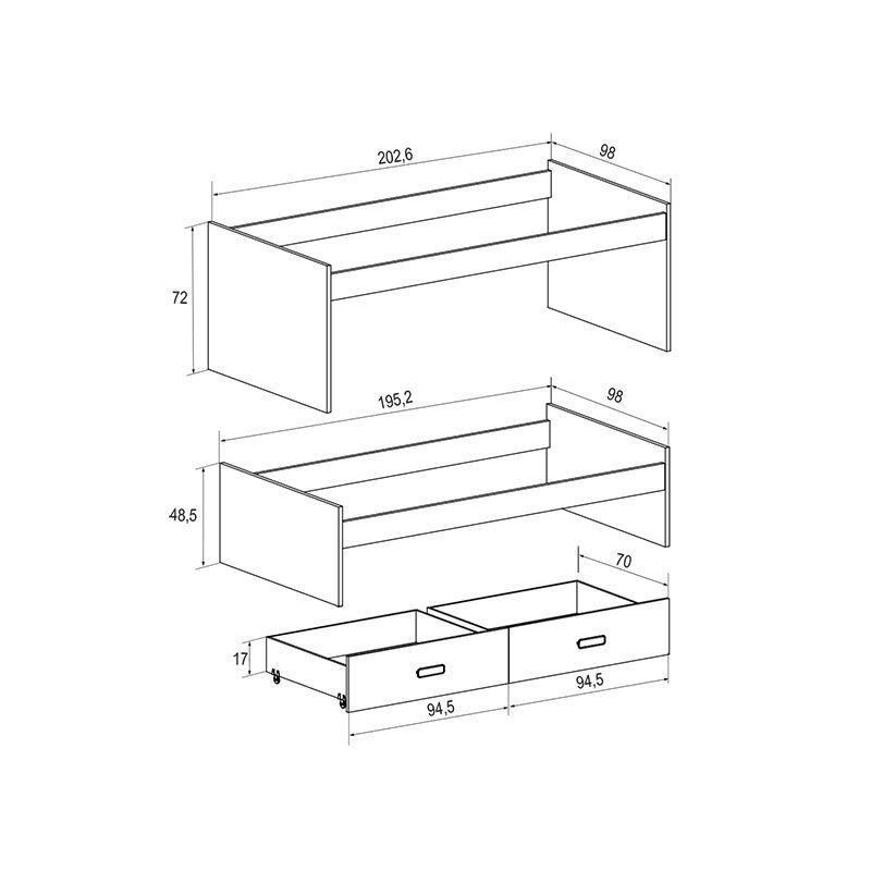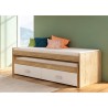 Cama compacta que dispone de dos camas (una superior y otra inferior que se extrae) y dos cajones para aumentar la capacidad del dormitorio. Ideal para dormitorios de la serie Champions.