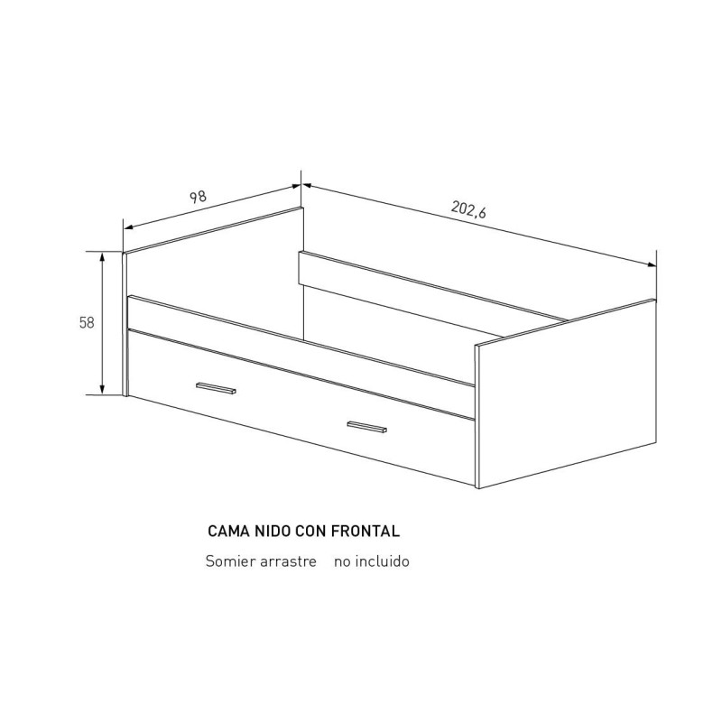 No incluye colchones ni somieres. Necesitarás dos colchones, un somier y un somier de arrastre (imprescindible para anclar al frontal de la cama) de 90x190cm. Podrás encontrarlos en nuestra sección de descanso.