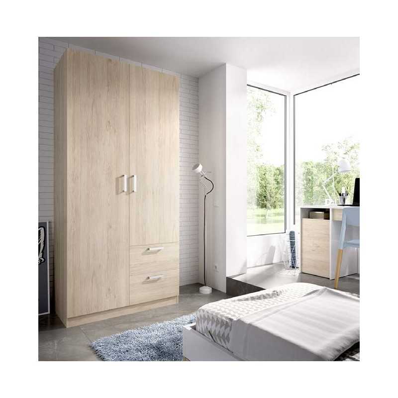 Te presentamos este increíble armario 2 puertas y 2 cajones modelo MAXI  que te otorgará unos resultados únicos. Su diseño en color blanco le proporcionará a tu hogar una luminosidad extra y dispone de un gran espacio interior. EN COLOR BLANCO Y NATURAL MEDIDAS 100X215X52