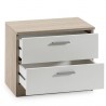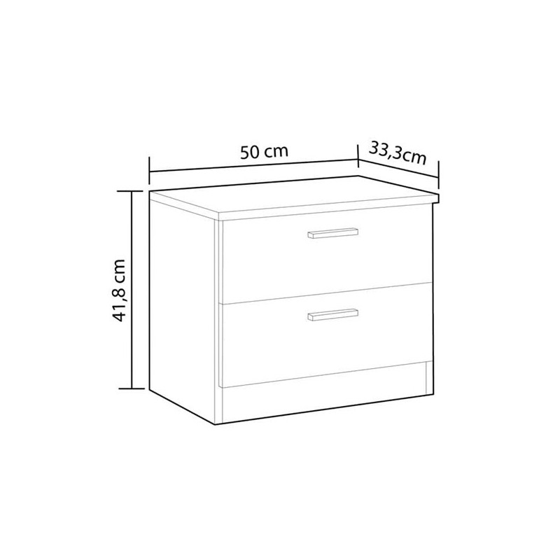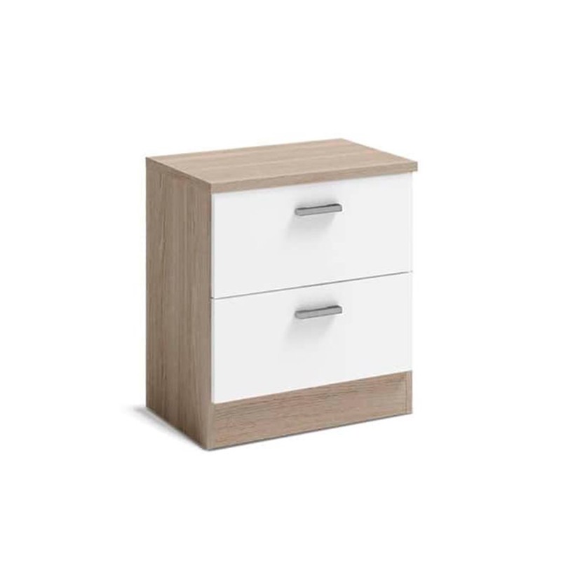 Estructura en melamina de alta resistencia color sahara y blanco. Cajones con guías metálicas. Su diseño moderno y elegante, con líneas sencillas y colores neutros, combina con cualquier diseño de dormitorio.