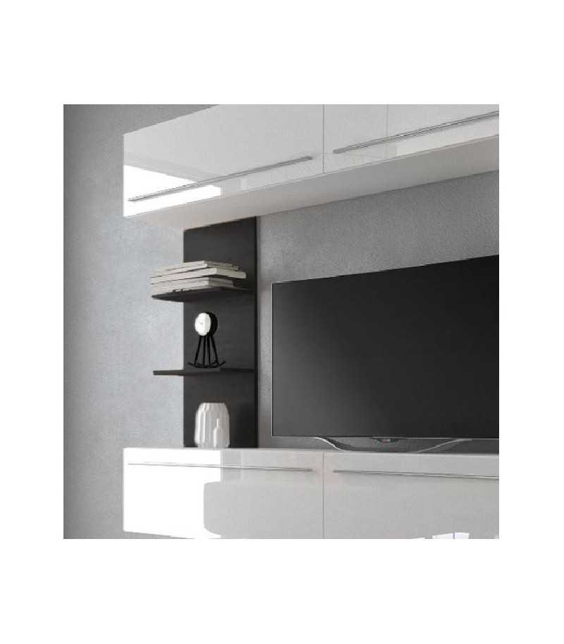 Composición de Salón Colina, acabado sintético blanco brillo/ébano con tiradores metálicos en acabado cromado. Se compone en su totalidad de módulos para colgar en la pared y lleva las luces leds incluidas en el módulo de la vitrina. Se sirve totalmente desmontada.