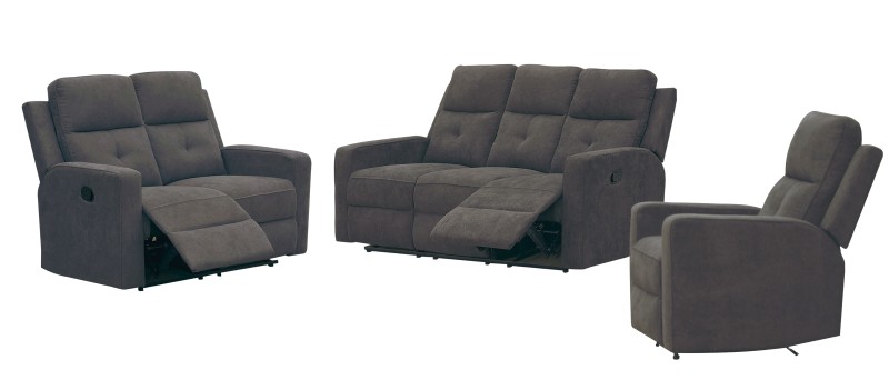 SOFAS 3 PLAZAS ,2 PLAZAS ,1 PLAZA TAPIZADOS EN TELA CON RELAX MANUAL, EN COLOR GRIS Y MARRON CHOCOLATE.