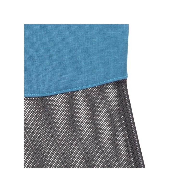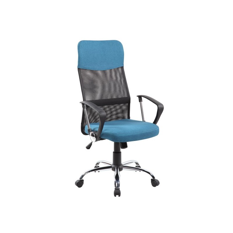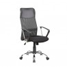 Silla de oficina con respaldo alto y ergonómico tapizada en símil piel negra o tela en colores azul y rojo a la altura del reposacabezas y tejido 3D negro en el resto.  Dispone de refuerzo lumbar, patas metálicas en acabado cromado, mecanismo hidráulico elevador, sistema de balanceo y brazos desmontables.  Medidas 59*60*110-120 cm.