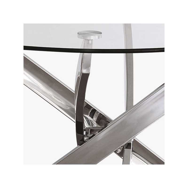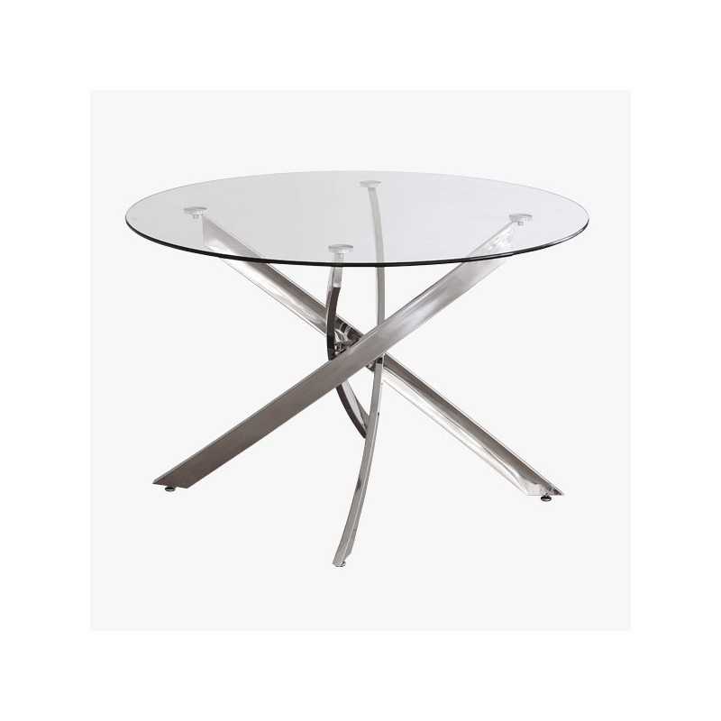 La mesa de comedor Carolina es redonda y fija. Tiene la tapa en cristal templado de 10mm de espesor y las patas son metálicas en acabado cromo.