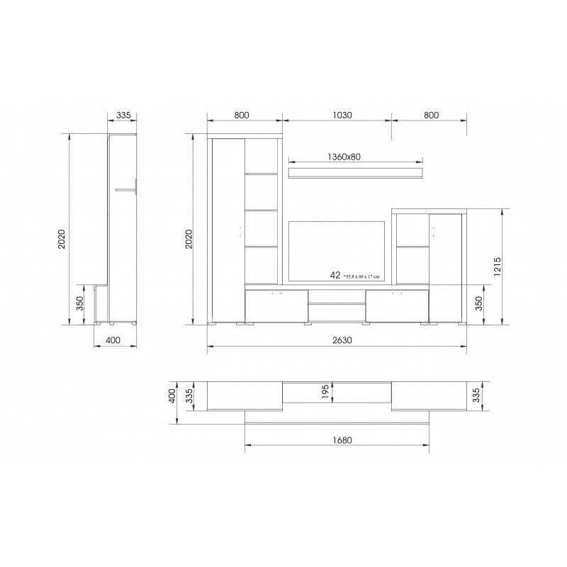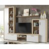 Composición de salón en acabado roble arena en estructura y frentes con detalle en blanco mate. Tirador en acabado aluminio. Leds incluídos. Grosores simulados de 6 cm. Gran capacidad de almacenaje. Se sirve totalmente desmontado. Medidas: 300x200x41/39 cm