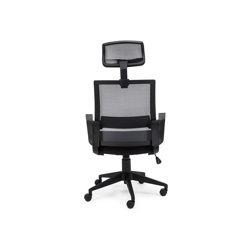 Silla de oficina en tejido 3D color negro. Dispone de mecanismo hidráulico elevador, sistema de balanceo, refuerzo lumbar y respaldo ergonómico.