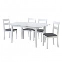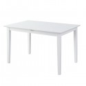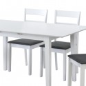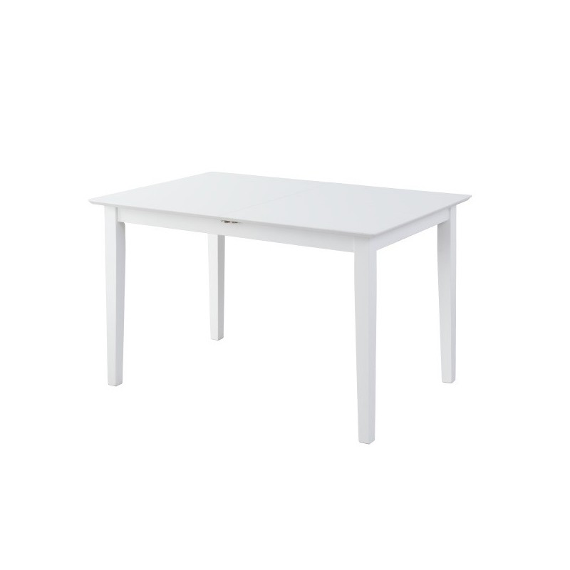 Mesa de comedor con tapa fabricada en MDF lacada en color blanco mate y patas de madera con el mismo acabado. Dispone de una extensión central tipo libro con sujeciones bajo tapa. Se sirve desmontada en 1 bulto.  Medidas: 120/150*80*73.8 cm.