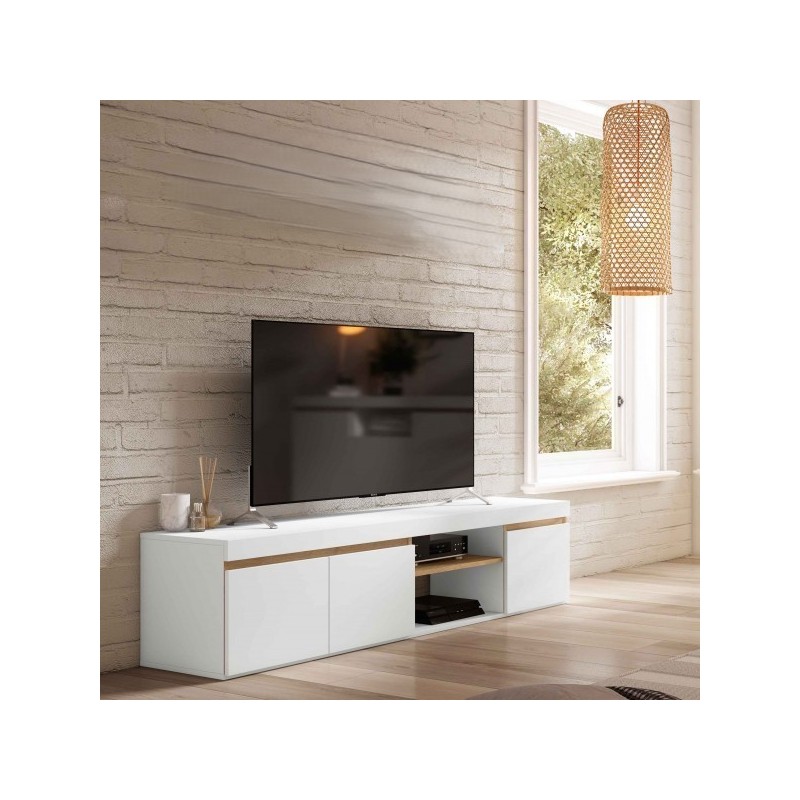 El Mueble para TV Elis de 160 cm de ancho, está realizado en melamina de alta calidad de 16 mm. con acabado en color blanco mate y detalles en naturale. Este mueble cuenta una base plana para apoyar el TV, además de un espacio de almacenaje compuesto por una bandeja perfecta para ubicar todo tipo de aparatos (reproductores, consolas...), y tres puertas abatibles que habilitan otros tres espacios extras para guardar según necesidad. en blanco
