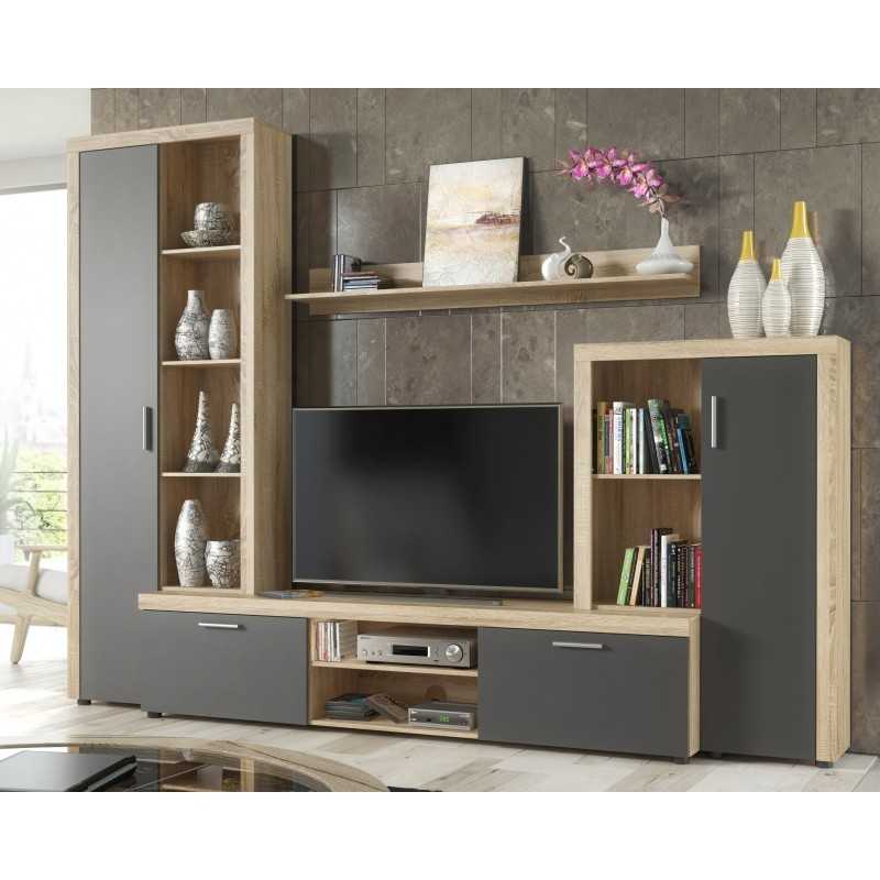 Composición de salón en acabado roble arena en estructura y frentes con detalle en blanco mate. Tirador en acabado aluminio. Leds incluídos. Grosores simulados de 6 cm. Gran capacidad de almacenaje. Se sirve totalmente desmontado.