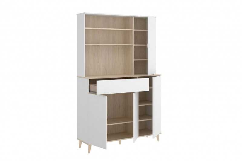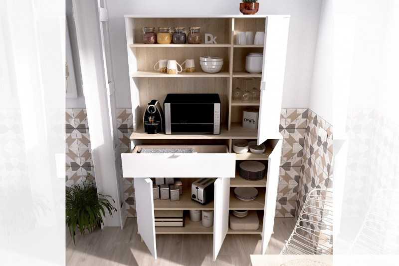 Mueble auxiliar perfecto para mantener la cocina ordenada gracias a un hueco con estantes, un cajón y tres compartimentos con puertas. Color Blanco y Natural.