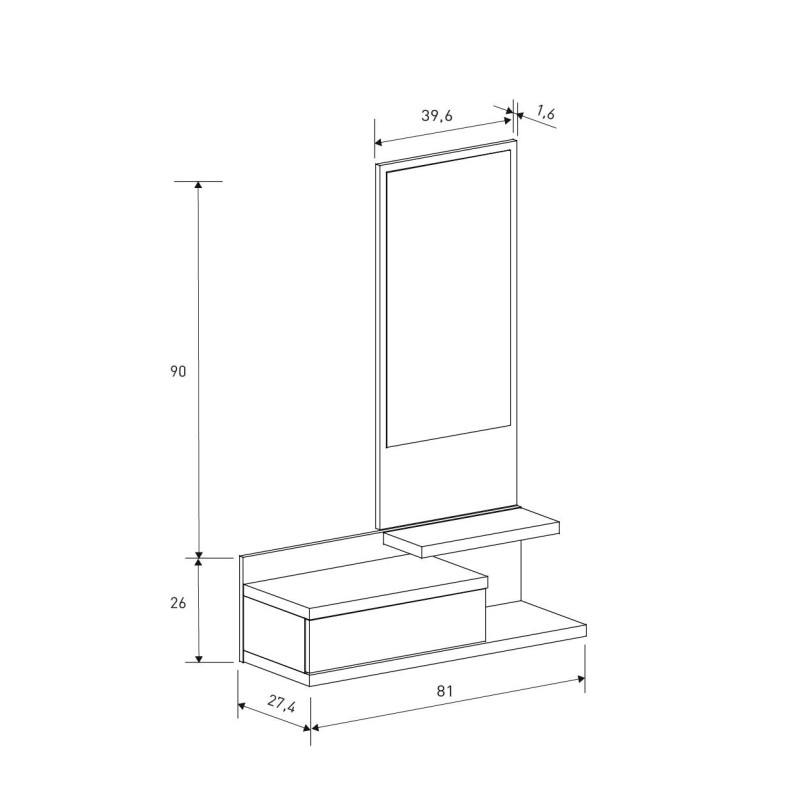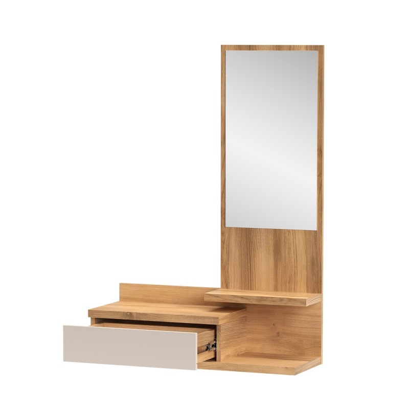 Fabricado en melamina resistente, ofrece durabilidad y fácil mantenimiento. Su estructura incluye un marco y un taquillón, proporcionando espacio funcional para guardar accesorios, bolsos o llaves, manteniendo el recibidor ordenado y acogedor.